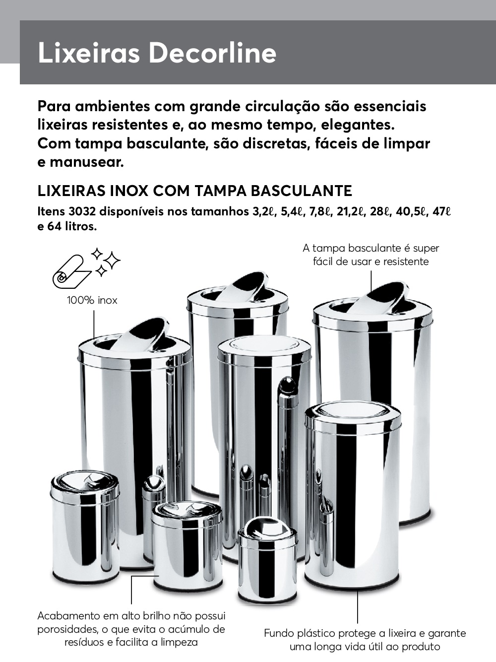 Ambientes residenciais e comerciais precisam de recipientes para depositar os resíduos e, normalmente, estes objetos são super manuseados e utilizados. Por isso, a Decorline lançou uma linha de lixeiras completa: discretas e muito elegantes, resistentes, fáceis de limpar e manusear. Seu corpo em aço inox com acabamento alto brilho não apresenta porosidades, o que evita o acúmulo de resíduos e facilita a limpeza. A tampa basculante é super fácil de usar e resistente e o fundo plástico protege a lixeira e garante longa vida útil ao produto.